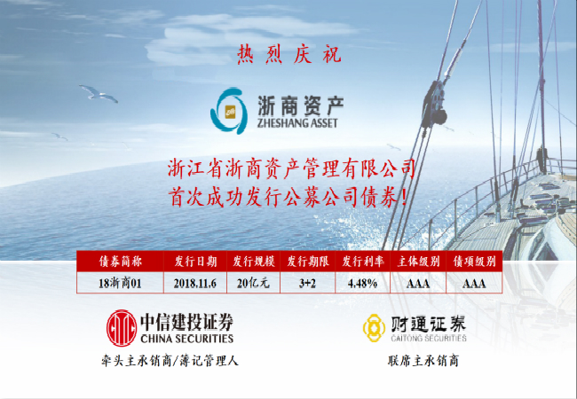 11月6日,浙江省浙商資產(chǎn)管理有限公司(簡(jiǎn)稱“浙商資產(chǎn)”)首次成功發(fā)行公募公司債券,募集資金20億元,期限“3+2”年,票面利率4.48%(低于銀行三年期貸款基準(zhǔn)利率近30BP),由中信建投證券、財(cái)通證券聯(lián)合承銷。全場(chǎng)認(rèn)購(gòu)倍數(shù)達(dá)1.83倍,投資者認(rèn)購(gòu)踴躍。